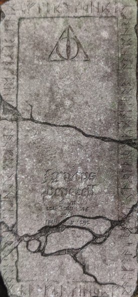 The scenery includes additional tombstones, mostly small generic ones, but one stand out as it has the “Deathly Hallows” symbol on it.