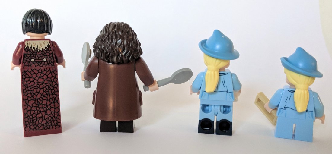 Three of the four figures have printing on the back. Madame Maxime has both torso and the slope brick making up her dress printed, Fleur has torso and legs printed while Gabrielle only has the torso printed. It would have been nice having Hagrid’s back printed too to match the hairy look of the front. In practice the sides and arms probably would have to be printed as well to make it look consistent, making it costly to achieve.