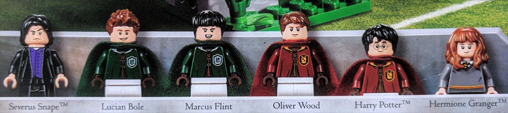 The photo below shows the line-up. From Gryffindor, we get Harry Potter and Oliver Wood. Then we have Hermione Granger and Professor Snape as spectators. Lastly, we get Lucian Bole and Marcus Flint from Slytherin. Apart from Lucian Bole, all others have previously appeared as minifigures.