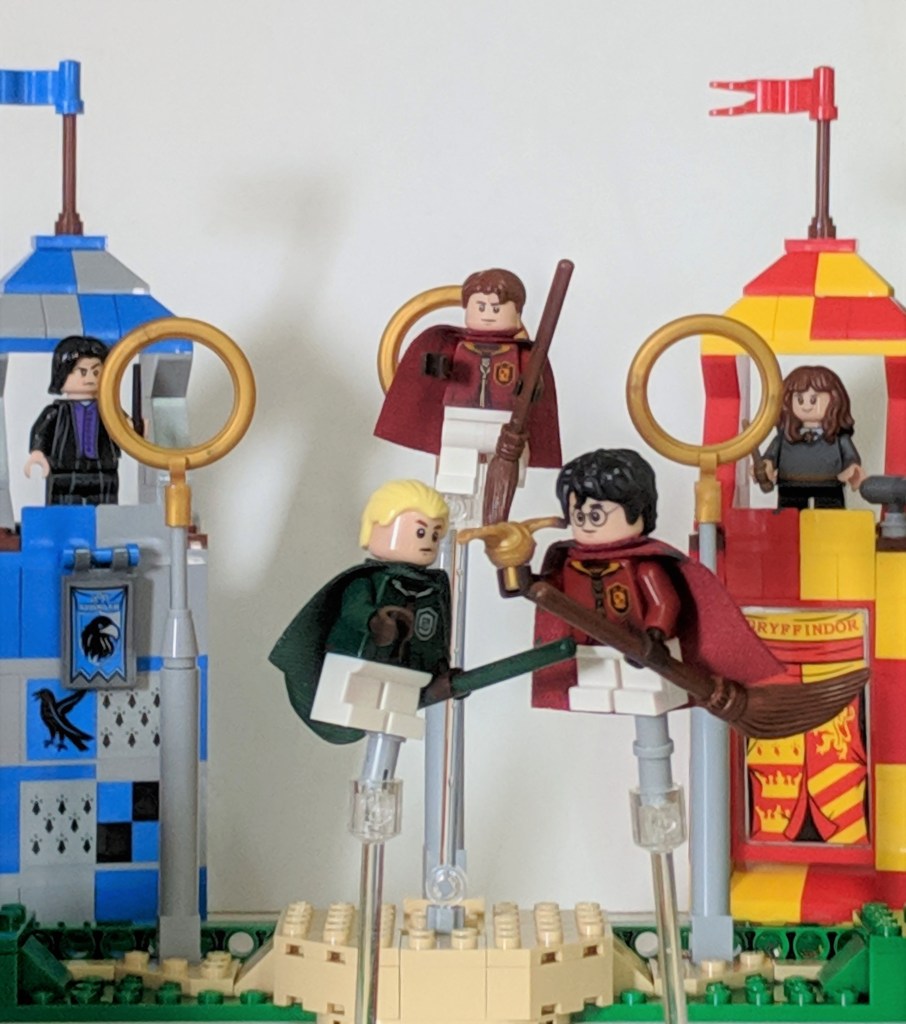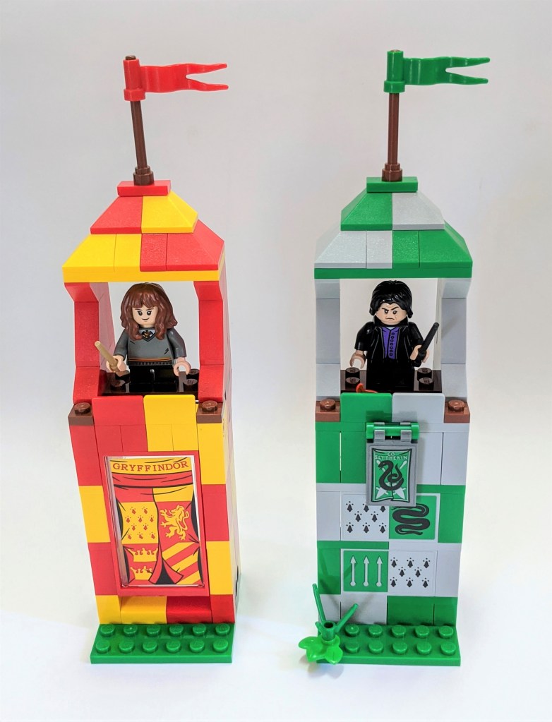 Should you desire so, buying a second one will allow you to combine to get a full oval surrounded by with eight towers full of spectators. You may consider chasing up Bricklink or similar for other head and hair pieces for the Quidditch players in the second set. Can you make the chasers Angelina, Alicia or Katie? Or what about the beaters Fred and George Weasley?