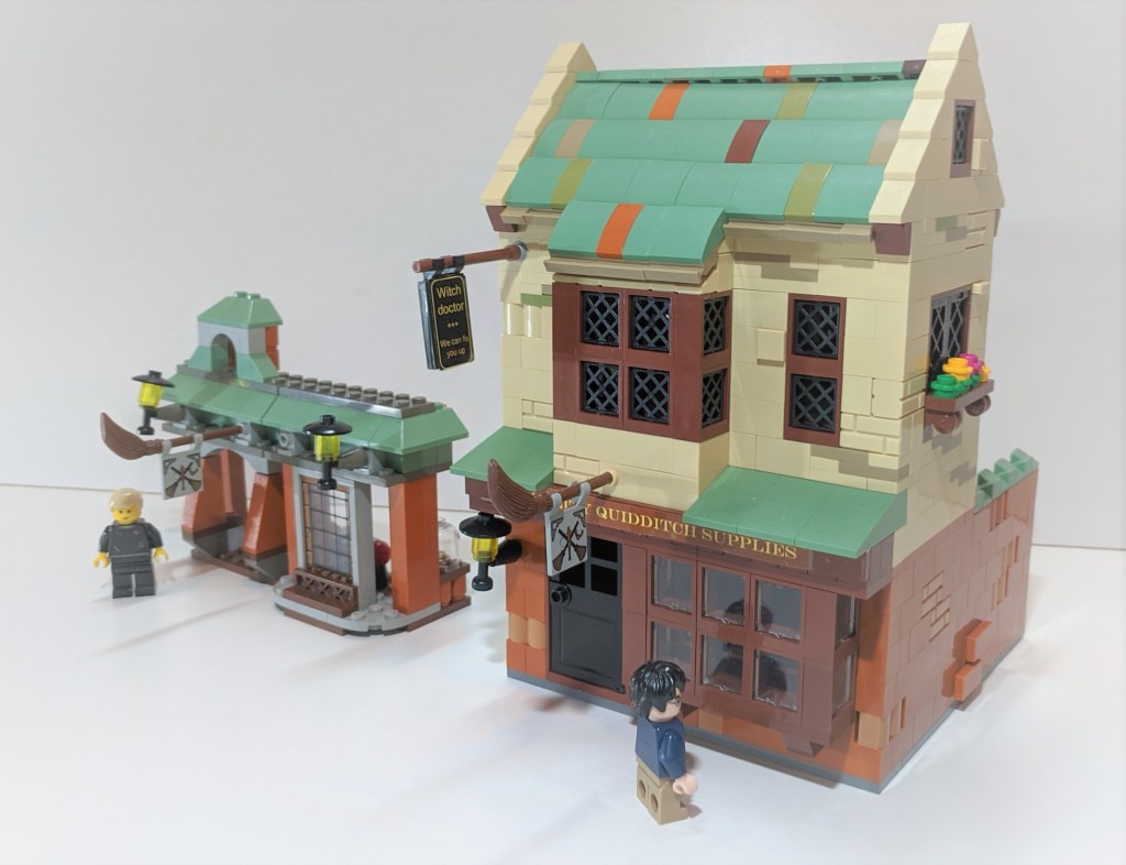 The original Quality Quidditch Supplies shop to the left and my own model to the right