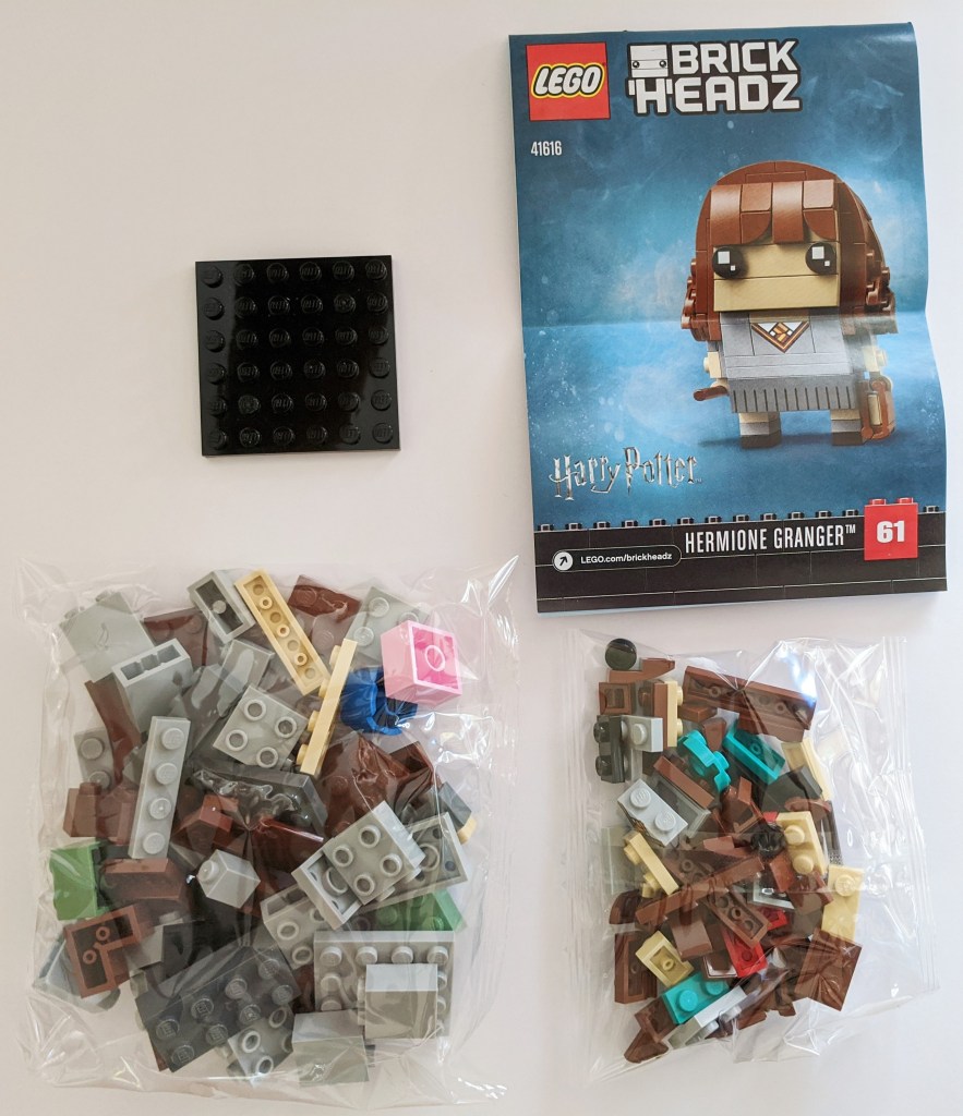 In the box, you find two bags of bricks, a 6×6 black plate (used as base for the figure) and the instruction manual. As mentioned in the previous review, the manual is the same thin paper with not “exclusive” collector type material about the subject. Simply instructions and a part list – with no information about Hermione – or Brickheadz figures in general. I still feel that is a missed opportunity for a product targeting collectors.