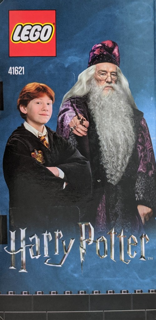 First, I will as usual briefly cover the box and content. It using the misty dark blue background of the 2018-2020 Harry Potter sets with the Brickheadz branding at the top, and Harry Potter logo somewhat less visible in the lower left corner. The key feature is a photo of the Ron and Dumbledore Brickheadz figures, with their names and Brickheadz numbers (to keep track of your collection) listed below in a banner of black bricks.