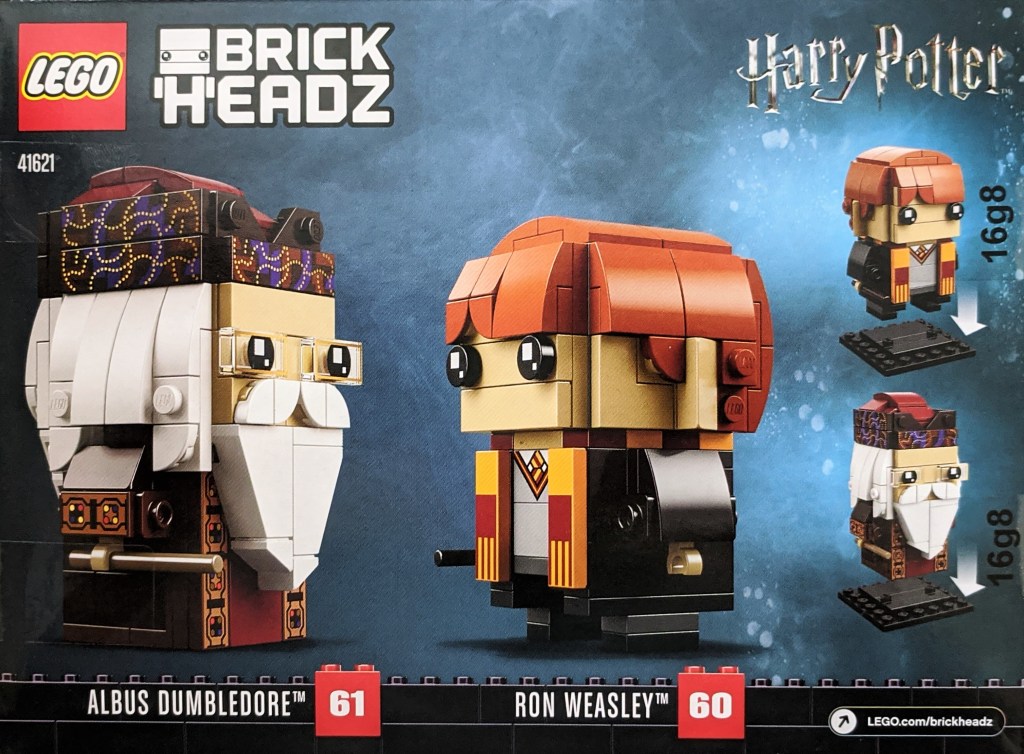 Brickheadz sets generally come in three different versions. A single pack, a single with a small companion pack, and a twin pack, which includes two full sized Brickheadz figures. The pack with Ron Weasley and Albus Dumbledore is one of the latter.