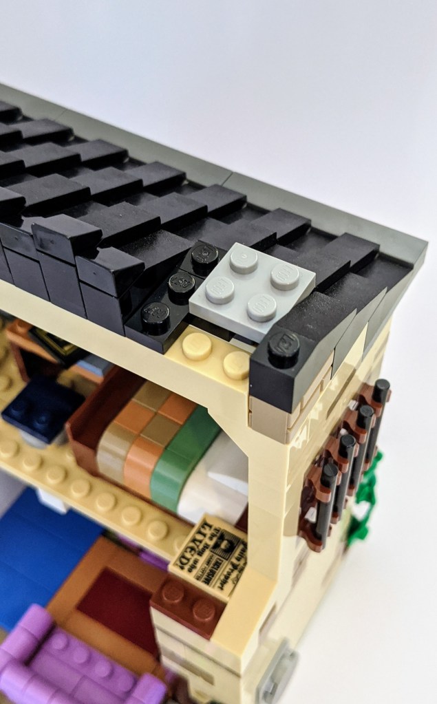 This change is by no means necessary, but my OCD got me convinced to prettify the roof of the house, as I realised I had all the pieces I needed for the upgrade. Basically, I wanted to get rid of all the 1×1 reddish brown round plates, replacing them with black 1×1 plates. Around the chimney, that is a bit more complex, but you still need only a few parts to fix. Finally, I added 1×1 black cheese slopes on the roof top.