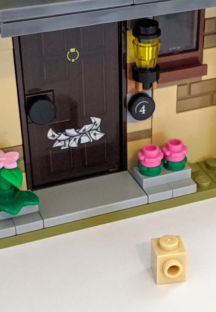 For completeness, and absolutely unnecessary, I also replaced the grey 1×1 brick with stud on the side, which had the number four sign. With the building half apart, that was easily done though.