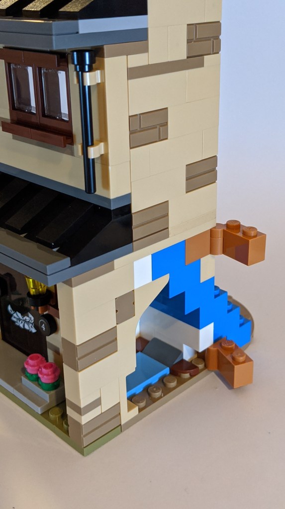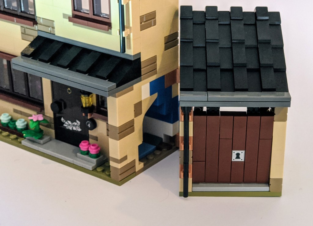 Next, I built the garage. The 2×8 olive green plate was used at the front to match the colour of the bottom layer under the house. Note that for the downpipe from the gutter, I had to replace the 1×4 black bar with a 1×3 bar instead (I used the 1×4 in step 1 instead). Otherwise, it would not fit under the roof that was to be added later.