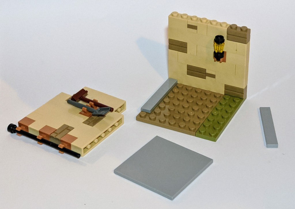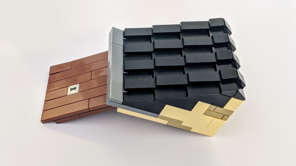 Firstly, I removed the 2×6 dark tan and 2×8 olive green plates underneath the house. These are both reused in the following. I then rebuilt the wall to only be one stud deep, as shown to the right below (this also shows the re-positioned lower hinge).