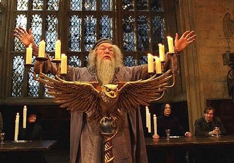 For comparison, here is Dumbledore standing behind his lectern at Hogwarts.