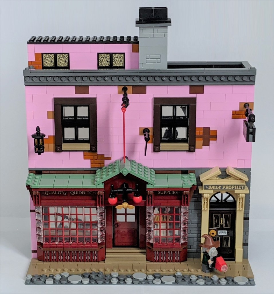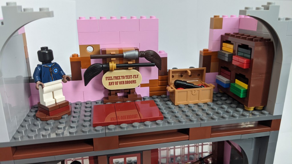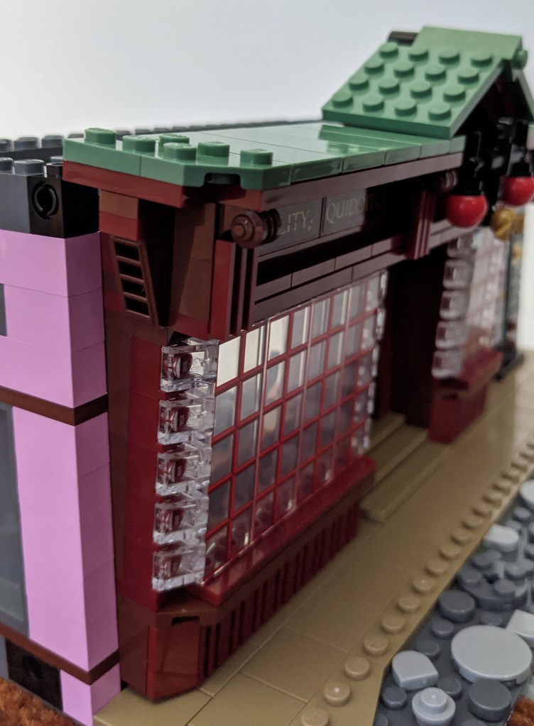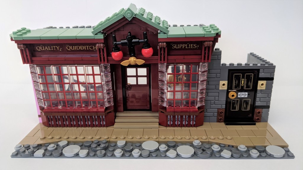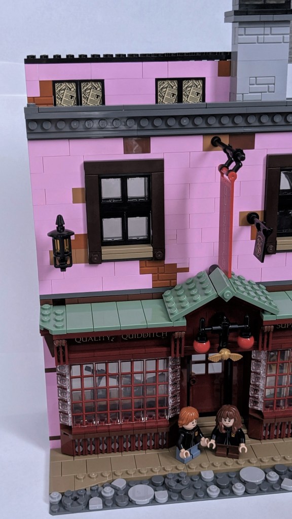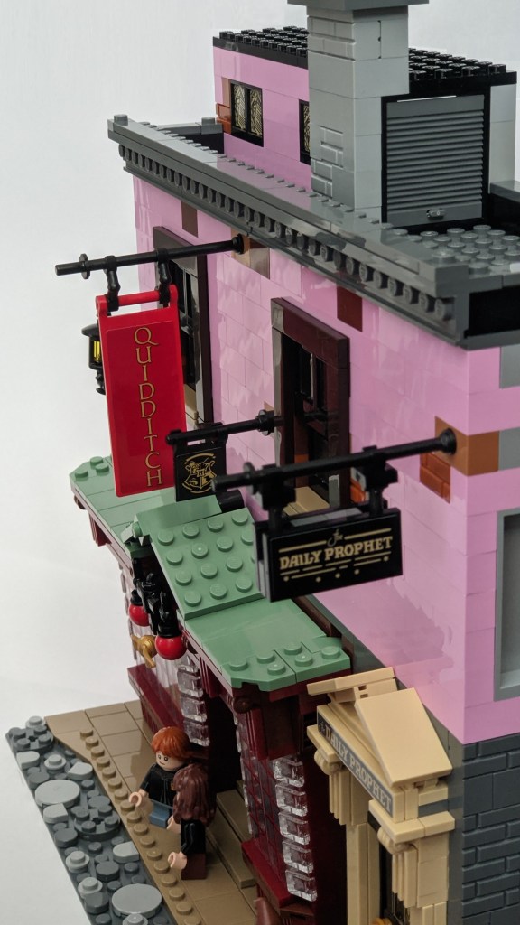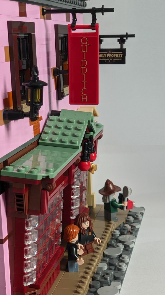 One thing that has been discussed a lot, is the pink colour of Quality Quidditch Supplies. And I must admit it is quite dominant given the size of the building. Talking to the lead designer Marcos Bessa earlier, he explained that based on the source material available, there wasn’t an exact match to LEGO’s current colour palette, and pink was found to be the closest available. The old lighter pink colour or sand red (which hasn’t seen much use in any sets) would have been more accurate. I think sand red probably would look quite well, but isn’t readily available.