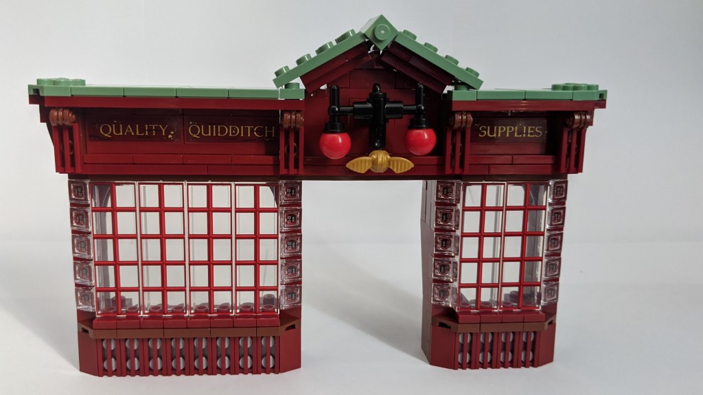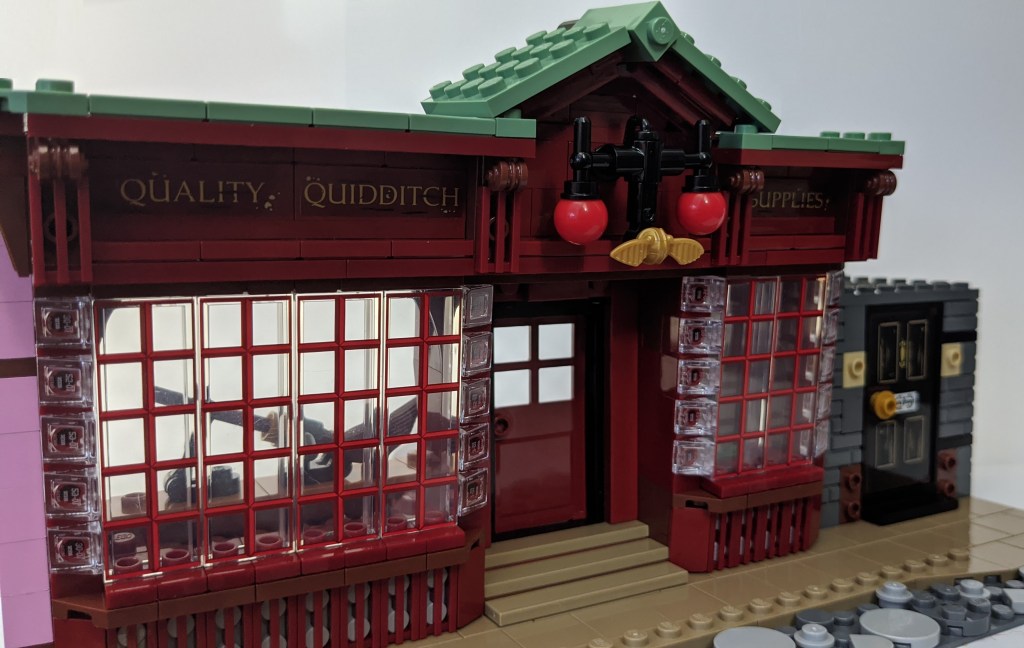As stated previously, this submodel covers the Quality Quidditch Supplies shop, which takes up most of the baseplate, as well as the entrance to the Daily Prophet, which is a newspaper in the wizarding world. The submodel is built from the pieces in bags numbered 6-9.