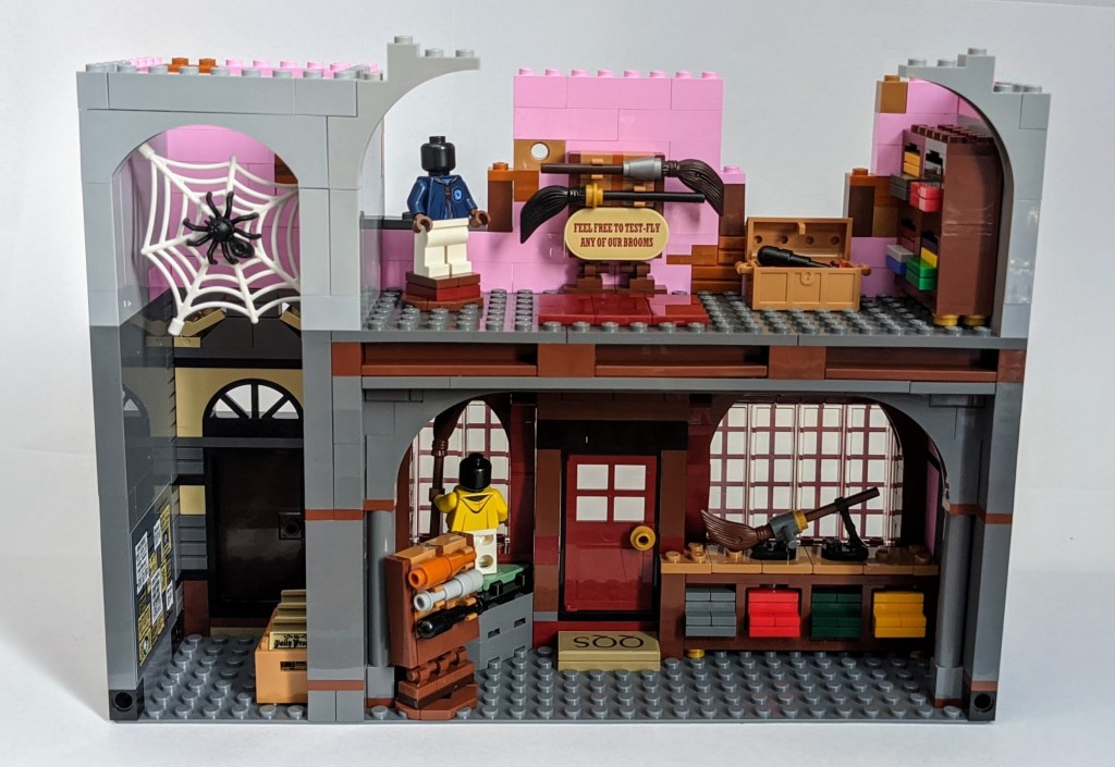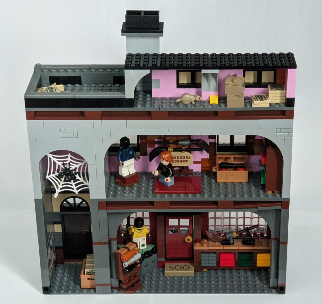 Turning around the model, we see the upper floor of the Quidditch shop is fully furnished too now, while the Daily Prophet doesn’t really have anything above then entrance than a spiderweb, which seems like a filler and a real room would have been appreciated instead.