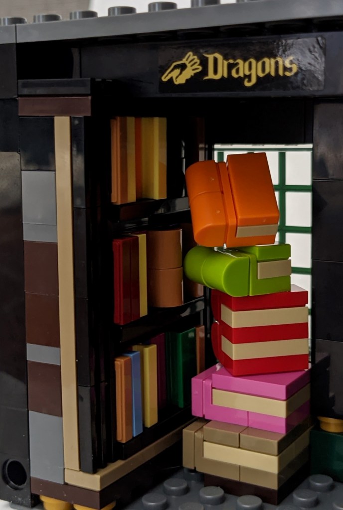 I remember from the movie how the bookstore was packed with both bookshelves and piles of books looking as they were just about tipping over (probably held in place with magic). There are a few such book stacks in the bookstore, and they work well to capture the atmosphere. I may add another couple to make it even more jam-packed.