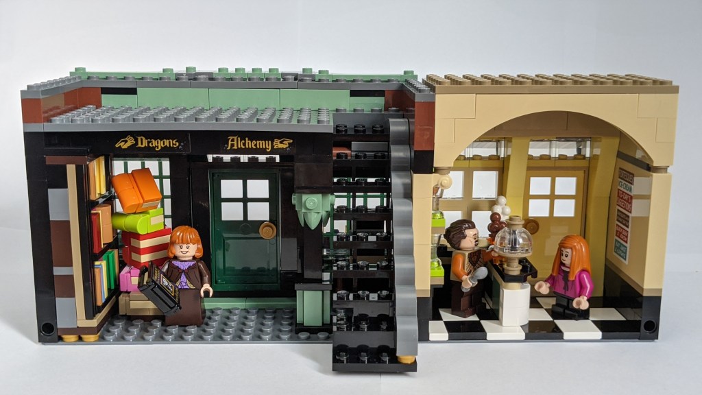 As mentioned above, this submodel covers Florence Fortescue’s Ice Cream Parlour and the book store Flourish & Blotts. It is built from the pieces in bags numbered 10-14.