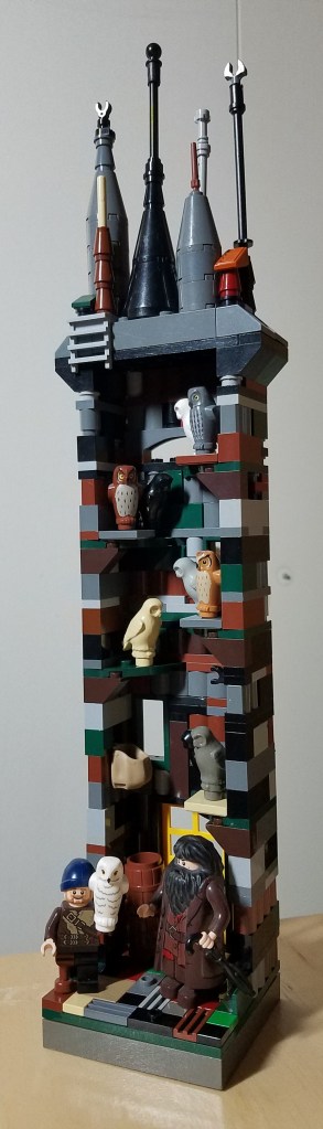 Hagrid shopping at Eeylops Owl Emporium: Hagrid has just bought Hedwig for Harry for his 11th birthday. While the competition rules restricted the models to 8×8 in size, there was no height limitation. Building a tall shop full of owls is a great idea, and we liked this model by Jennifer Brawn Gittings, which also featured good detail in addition to the impressive height.
