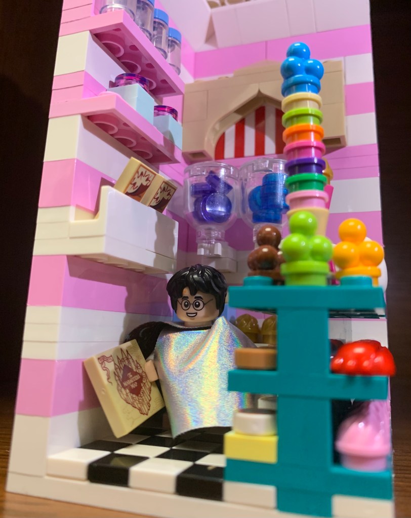 This third place was another close race. But combining the scores, this vignette by Lindsay Wayne came out just ahead of a few others (and wasn’t far away from a first place either). It shows Harry at Honeydukes under his invisibility cloak, having travelled the secrets tunnels from Hogwarts to Hogsmeade using the Marauders map. The vignette has shelves full of colourful lollies and a nice tiled floor.