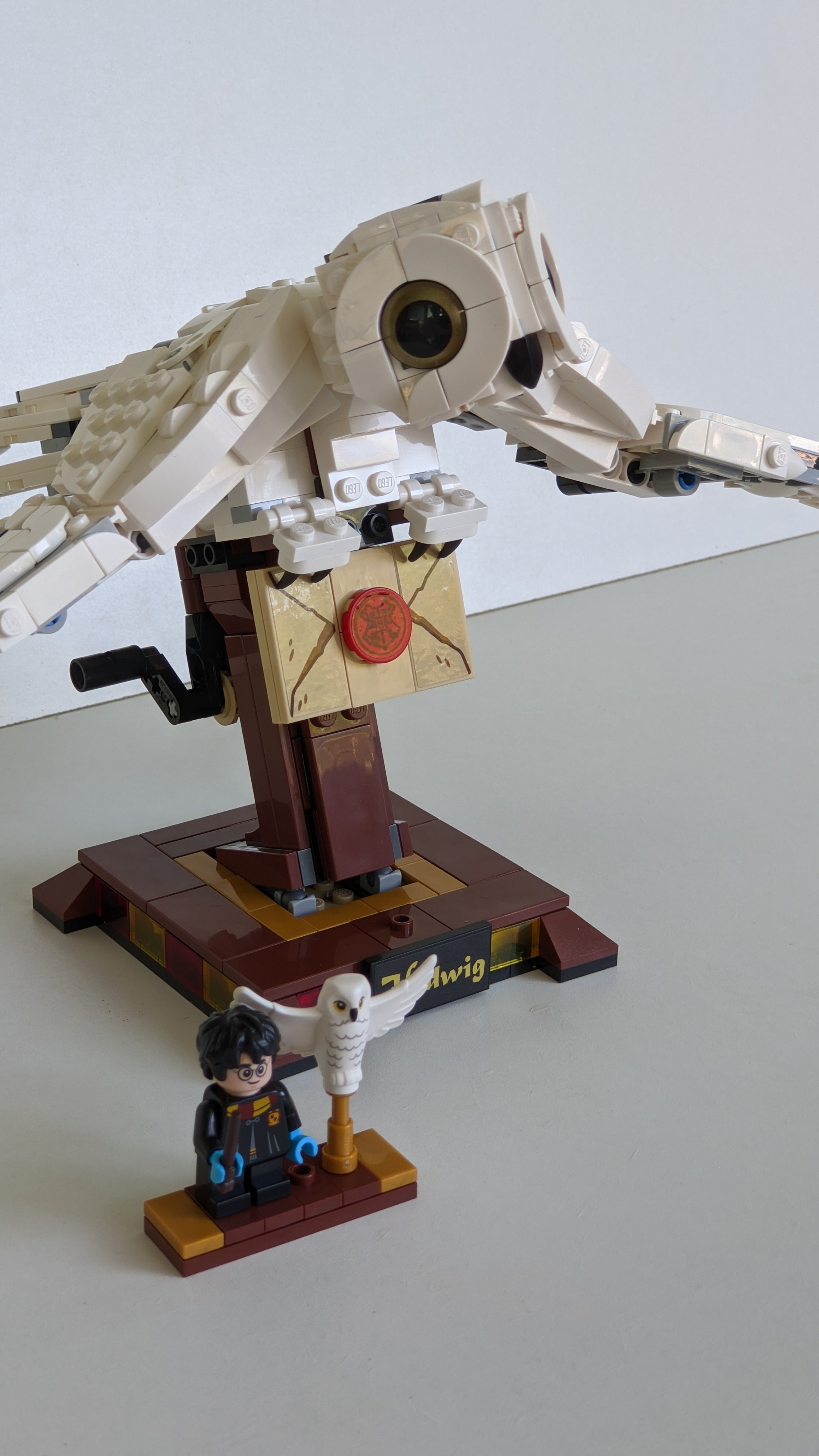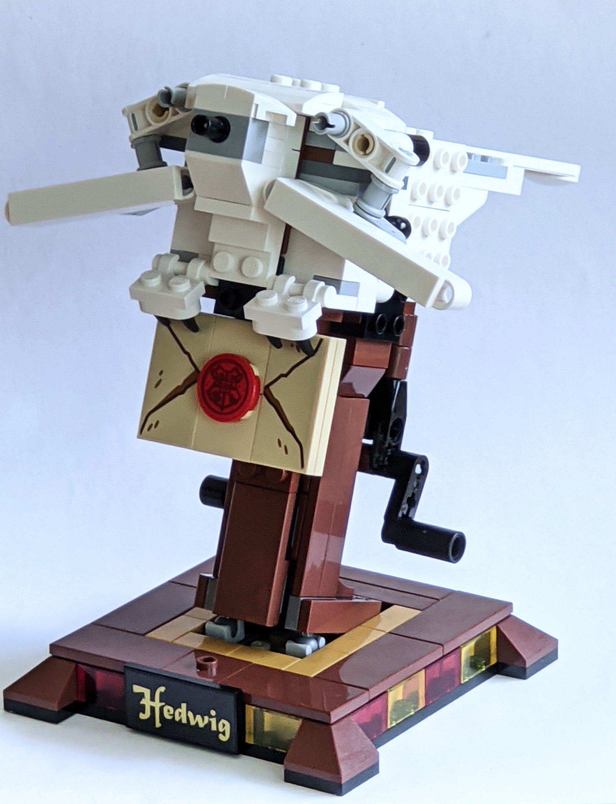 You start with building the small minifigure stand and then the big stand for Hedwig. The stand includes the crank to make Hedwig’s wings flap.