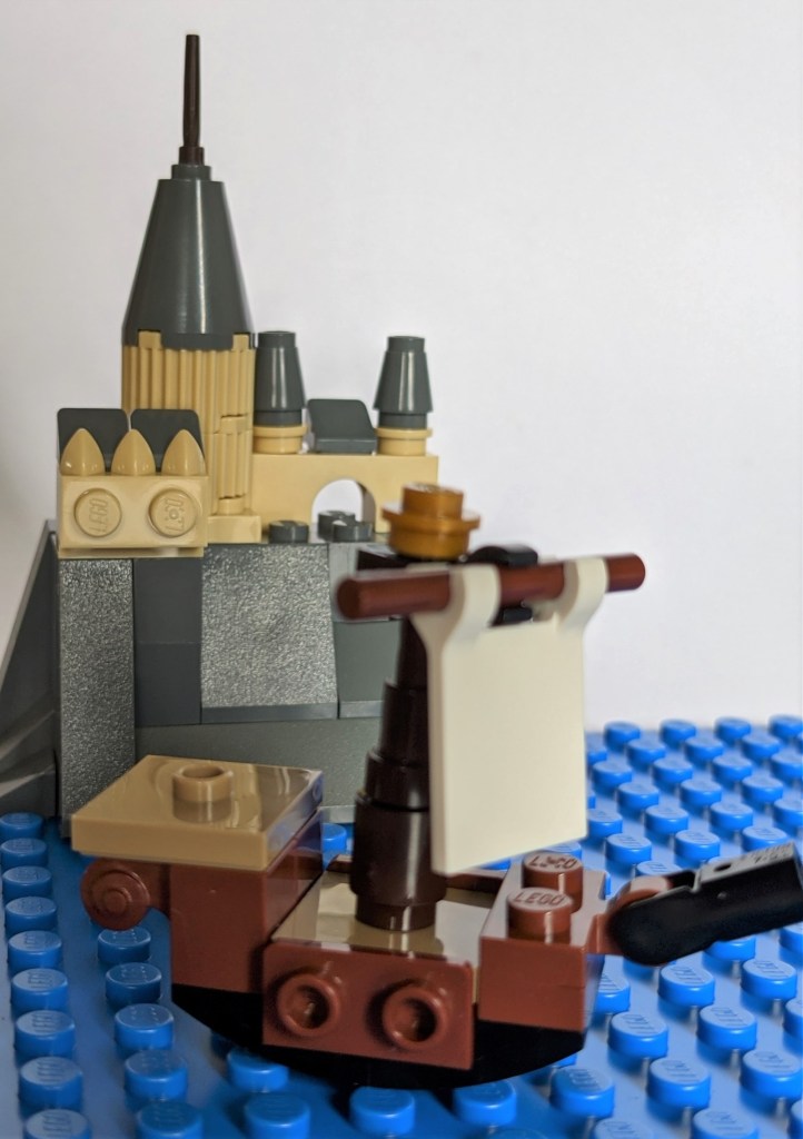 As noted in the beginning, having built the ship, I quickly got the idea of combining it with Hogwarts Castle from yesterday. Basically having the ship in the foreground with the castle as background.