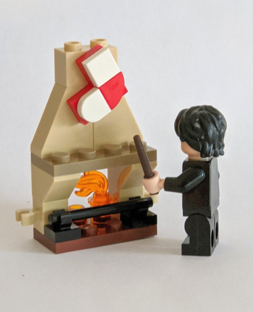 But it’s not just a fireplace. It comes with a Christmas stocking and that is (apart from the minifigures) the first direct reference to Christmas we have seen in this calendar (though the gramophone used for practising the waltz for the Yule Ball, was a strong indirect reference).