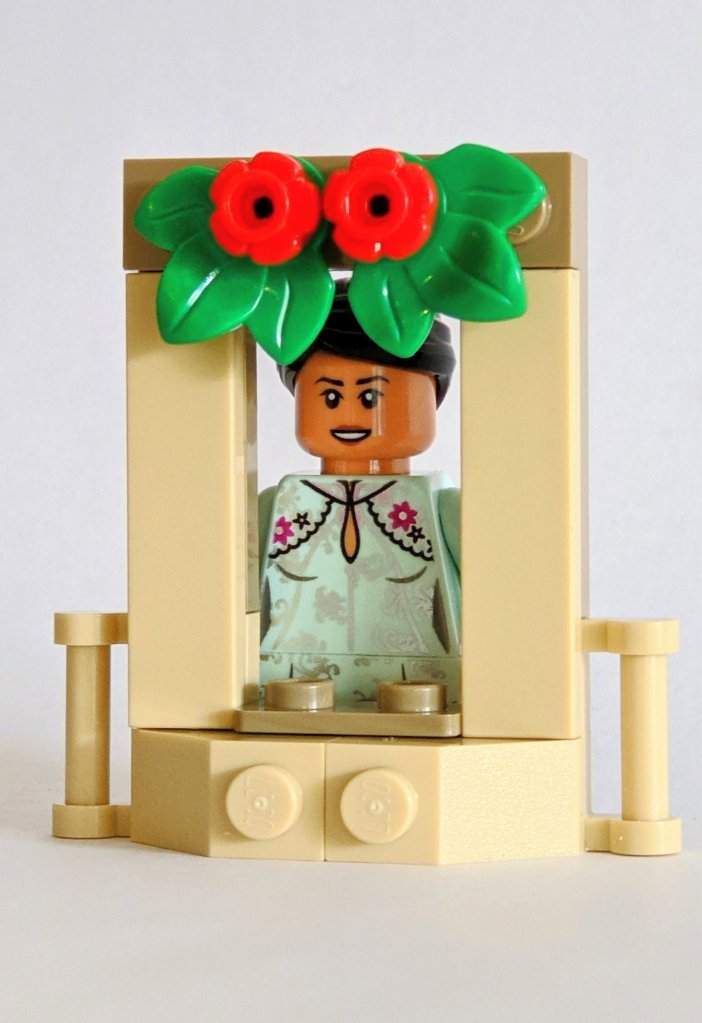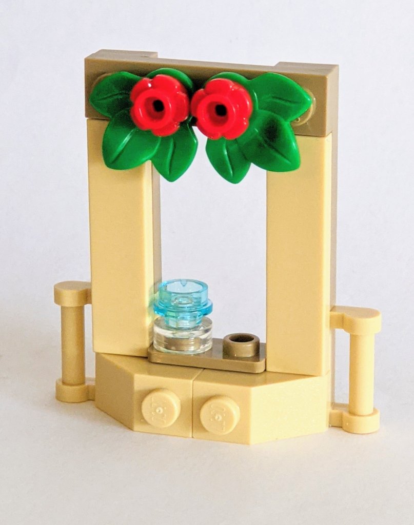 Here is what the completed model looks like. The greenery above the window helps to add some Christmas spirit. I assume the thing in the windows sill is a small glass jar. It could for example be the jar which Hermione used to catch Rita Skeeter in her animagus form.