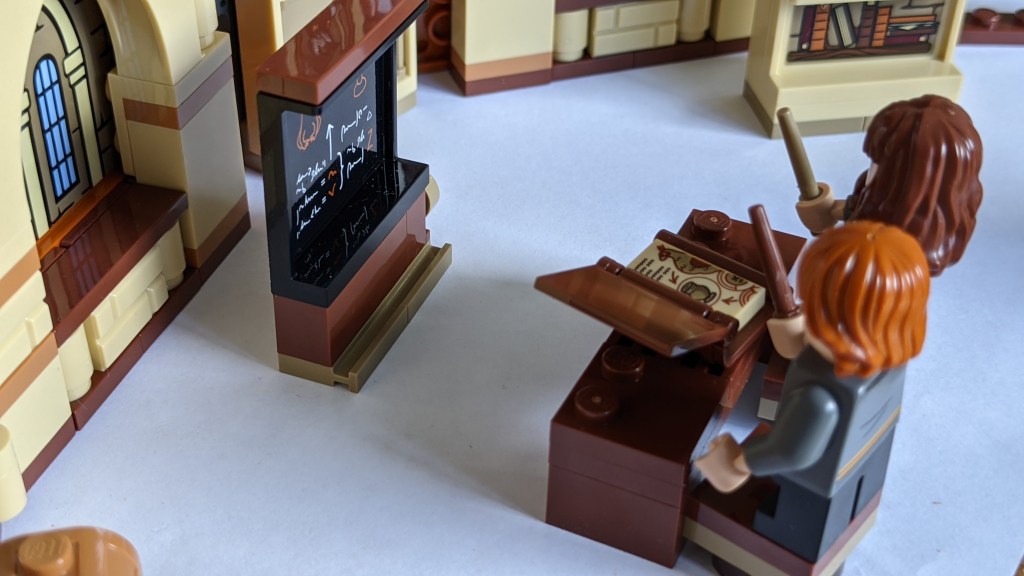 Bag 1 gives you two of the figures, and otherwise get you building a few small models and then get started on the book cover. The small models include a blackboard, a desk with two chairs, a chest and a small bookcase with various objects (probably to be subject for transfiguration).