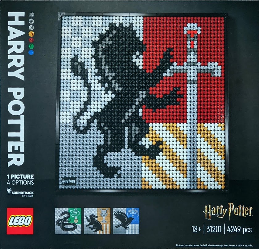 The box is square and rather flat. The front is dominated by black – the colour used for the set targeting the adult collectors, also highlighted by the 18+ age label. A large photo shows one of the four crests you can build from this set, with “Harry Potter” written along the left side, where it also lists that you can build one picture, choosing from four different options. The other three options are shown in small insert photos at the bottom.