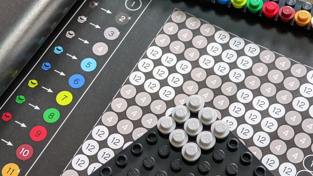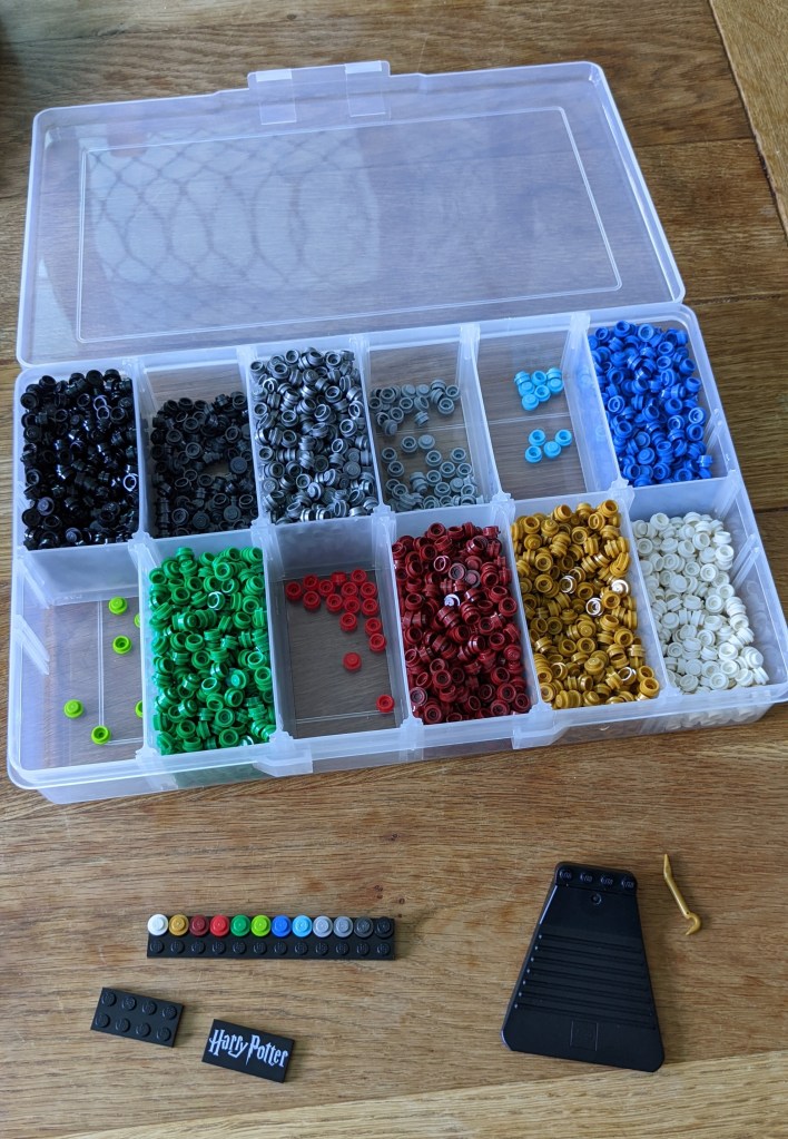 First I had to get organised. There were 4000+ pieces ready to be used, with 12 different coloured round plates included for the mosaics. Luckily, I had just for other reasons bought some plastic boxes which coincidentally had 12 rooms. One got repurposed as storage for the bricks.