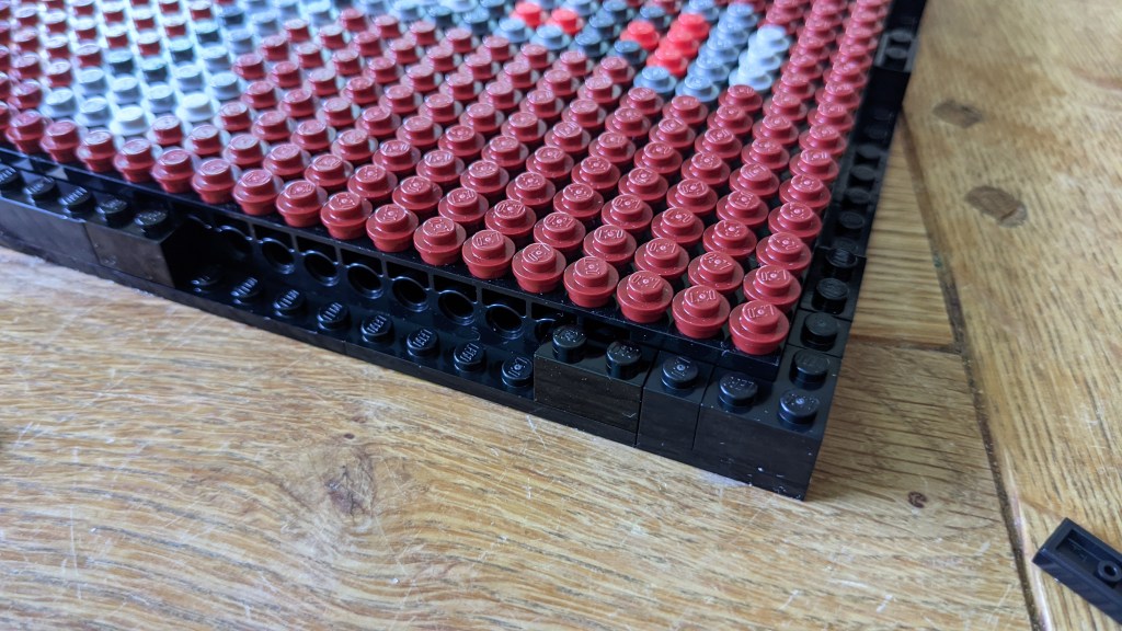 Once you have built all nine sections and attached them to each other in a 3×3 square, you build a frame using two layers of bricks around it. The frame is attached to the mosaic using 1×2 bricks with Technic pins. A layer of plates at the bottom ensures it all stays firmly in place.