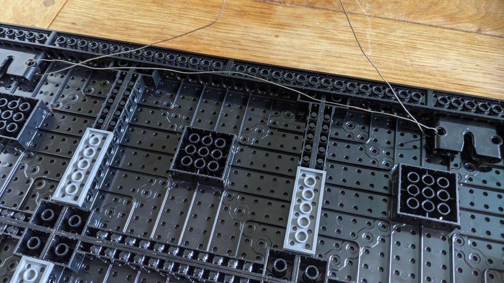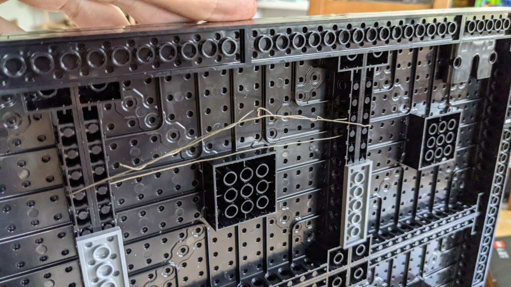 Once complete, you need to display it. You can simply let it stand on a shelf, but you can also hang it from the wall. For this, two Technic pieces are attached to the frame – perfect if you put two screws in the wall allowing it to hang firmly there. Unfortunately, the spot I had in mind already had one screw – centered. So I thought I could simply add some wire to make it hang from that. But adding the wire to the Technic pieces didn’t work as they got pulled out from the sideways force from the wire.