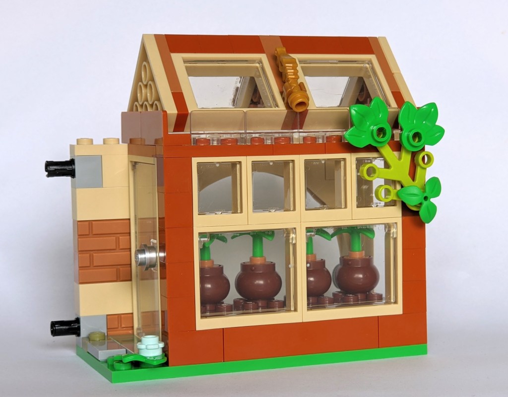 Here is what it looks like from the outside. The dark orange colour makes it stand out from the rest of the tan buildings. There is a bit of greenery on the side to emphasise it is a greenhouse, but I must say, I am not a fan of lime green plants, as they look unnatural (I know magical plants can probably have pretty much any colour, but I may still replace the lime green piece with a normal green).