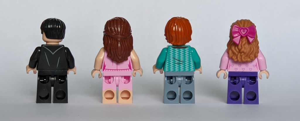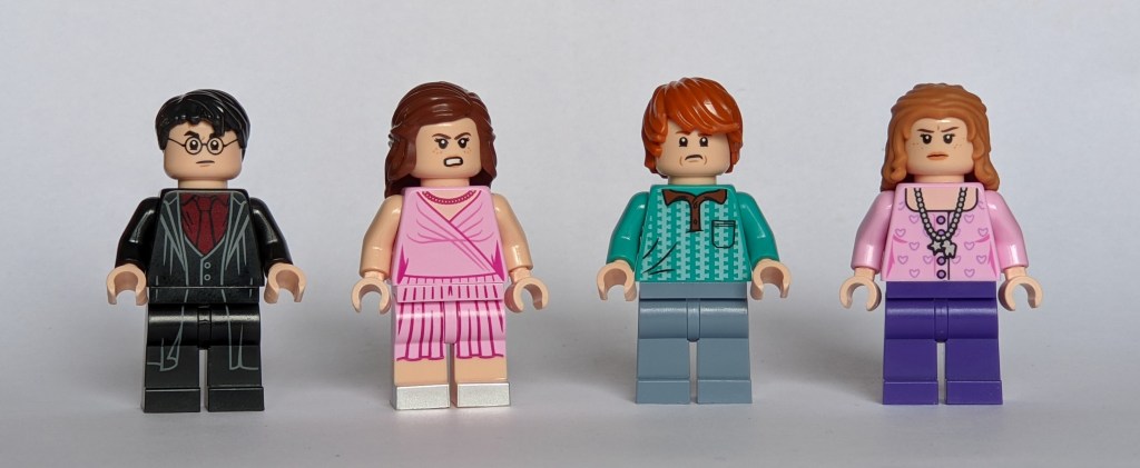 Here are four of the figures shown: Harry Potter, Hermione Granger, Ron Weasley and Lavender Brown. Harry and Hermione are in their Slughorn party dresses while Ron and Lavender, as mentioned above, are as they appeared in the post Quidditch game celebrations. The torso prints are highly detailed, and I’m pleased to see both Harry and Hermione have printed legs too, as many figures often use plain legs.