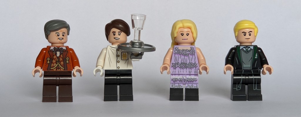 Overall, this gives us Slughorn and three of the invited guests (Harry, Hermione and Luna) and Neville who served at the event. Draco wasn’t actually invited, but was brought in by Mr Filch, who had caught him sulking around. It is also worth mentioning that Ginny Weasley is included in the Harry Potter Collectable Minifigure (CMF) Series 2.