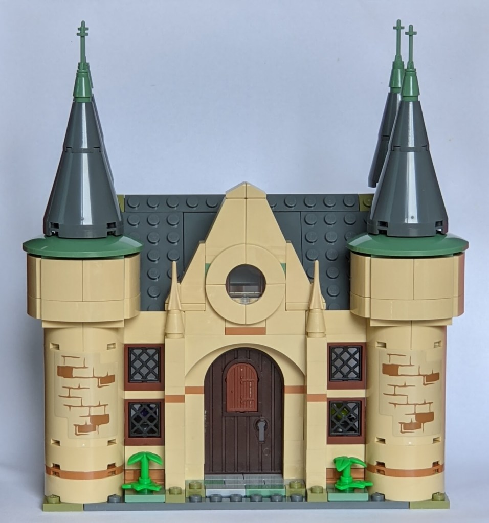 Our LEGO version is a very small scale version of this, but easily recognisable. Here is what it looks like from the front. Overall, I think they have captured this section of the castle quite well, considering the scale, and I’m pleased to see it included in the set. It would have looked better if bigger, but all the model designers must meet a specific price point, and I think they have done well in this case. It is interesting to see sand green make a (small) comeback – with some roof parts using that colour. Up until 2018, Hogwarts sets had used sand green as roof colour consistently, but with the modular Hogwarts series introduced in 2018 it shifted to use the more movie accurate dark bluish grey colour.