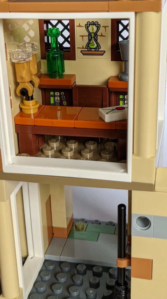 The room represents Professor Slughorn’s Potions classroom, and includes a “Advanced Potion Making” book as well as a couple of student desks. As we had already had a Potions classroom in the Whomping Willow set, it is not a great choice of room, but a reasonable addition nevertheless.