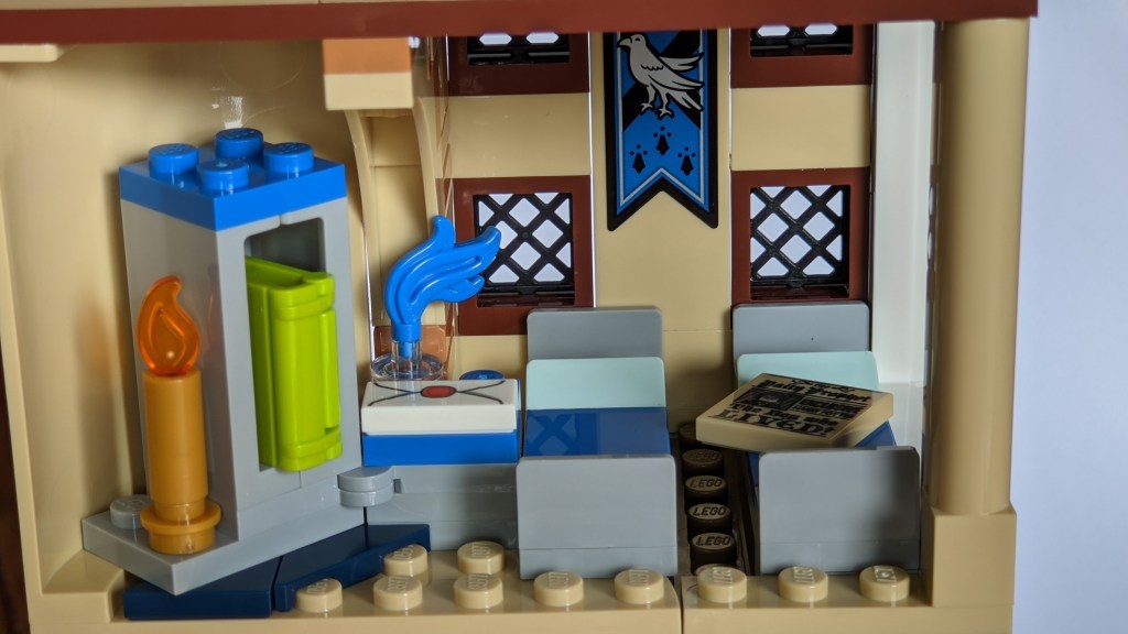 The photos below show the rooms in more detail (click to enlarge). The Ravenclaw common room includes a library with almost as many books as the main library. Hence the small bookshelf with the book and newspaper. It would have been nice if the while marble statue of Rowena Ravenclaw had been featured as well, but space is limited. What I like the most is the Astronomy equipment, which is very well built with nice part usage (NPU).