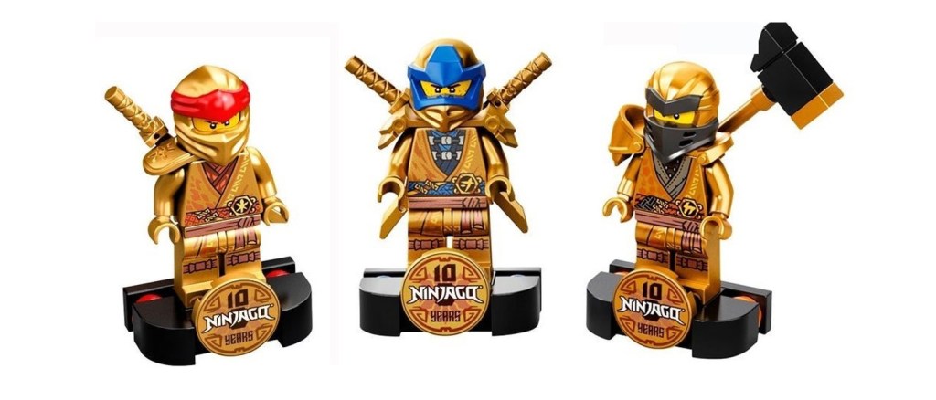 For the 10th anniversary of Ninjago, in early 2021 LEGO released four sets in the Legacy series, each of which included a golden figure (three of which shown below) on a stand. These sets give us Kai, Lloyd, Jay and Cole, but leaves out Zane and Nya, at least for now. Maybe a later drop (second half of 2021) will include those two characters?