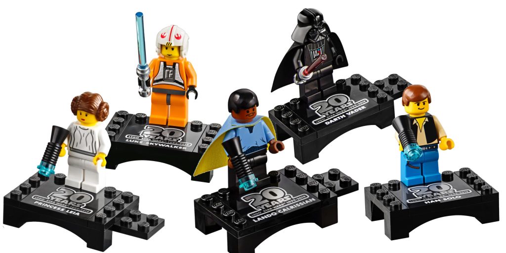 To coincide with the 20th anniversary of LEGO Star Wars in 2019, LEGO released a number of sets, including five sets that were updated versions of classic star wars sets. Each came with minifigure on an printed anniversary stand.