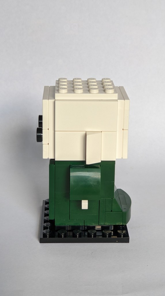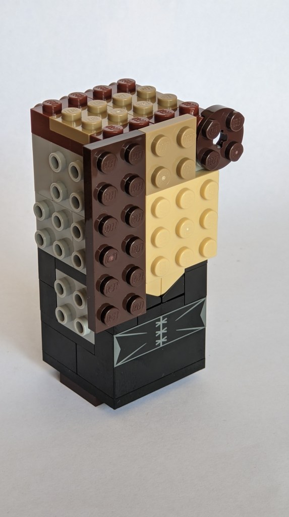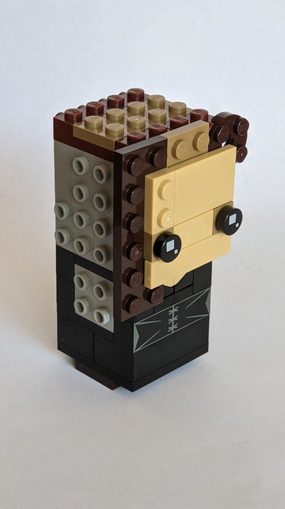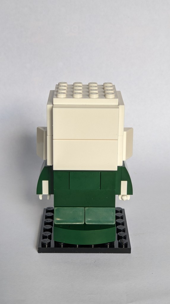 I’m not going to cover the building process in much detail, as this follows how these figures generally are built. The torso base is 4×4 studs, and build with studs exposed on sides to attach arms/hands, and other torso details. The head adds many more studs on side, as the key focus of the Brickheadz figures is indeed the head, which is a caricature of the subject, capturing the key characteristics in an often exaggerated way.