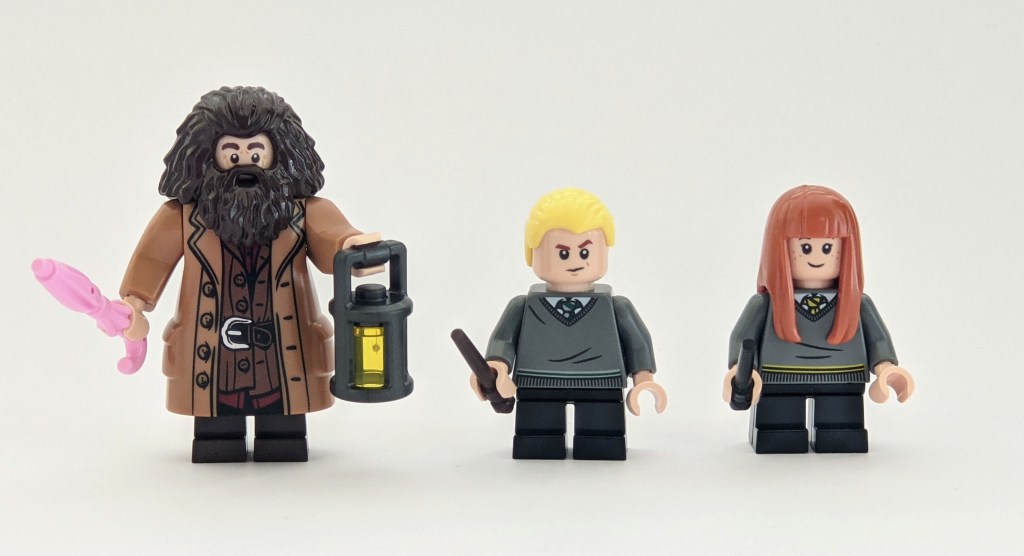 Not surprisingly, the set includes all three characters from the “trio”: Harry, Ron and Hermione. They come in Gryffindor sweaters and with the short, non-posable legs as shown below. The face print and included hair pieces represents the look of the characters in the early movies well. The back of their torsos are printed too. And as usual, the head pieces comes with dual face prints, showing both a glad and a scared version of the characters.