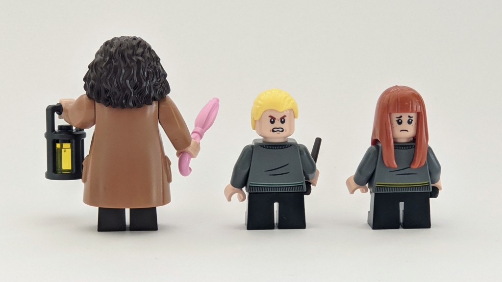 Next, we will look at Hagrid, the huge, but gentle friend of Harry, Ron and Hermione. Again, compared to what we have been used to from pre-2018 sets, the new moulded figure is an improvement, looking more well proportioned. The long moleskin jacket looks great, though some printing on the back would have been appreciated. He comes with a pink umbrella, which he used to hide his wand.