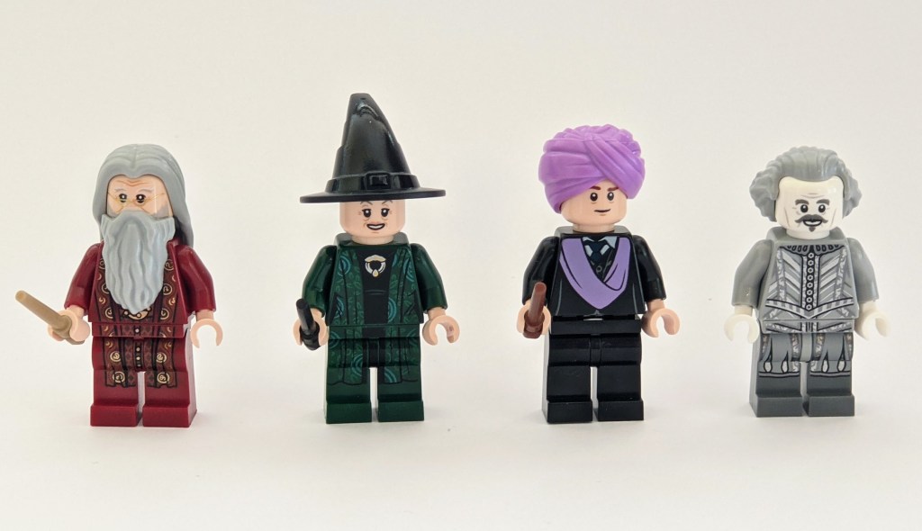 The set also includes three Hogwarts professors, and a long time Hogwarts resident – Nearly-headless Nick. The professors are Dumbledore, McGonnagall and Quirrell. The two former have been released a number of times previously, but as mentioned earlier, this is the first time we get Professor Quirrell with flesh skin, which is something I had been looking forward to for a while. All four figures have printing on the torso backs and three of them also on the leg fronts too. The printing is highly detailed and really enhances the figures, which all have dual face prints too.