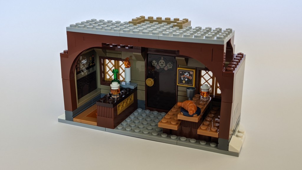 Next up is The Three Broomsticks. Bag number 4 allows us to build the entire ground floor. Inside you have the bar desk and a table with two benches where patrons can enjoy a meal or a refreshing butterbeer.