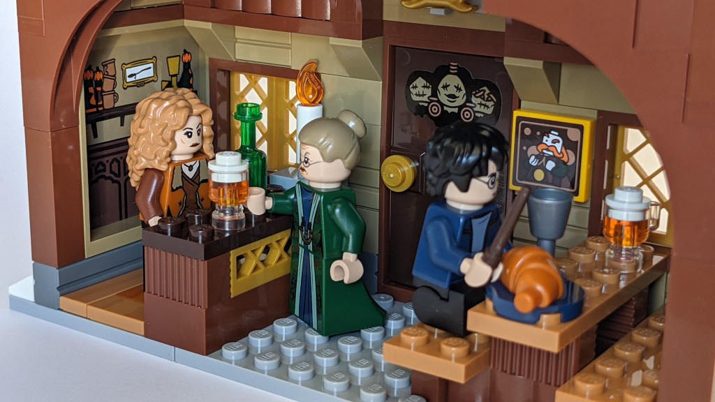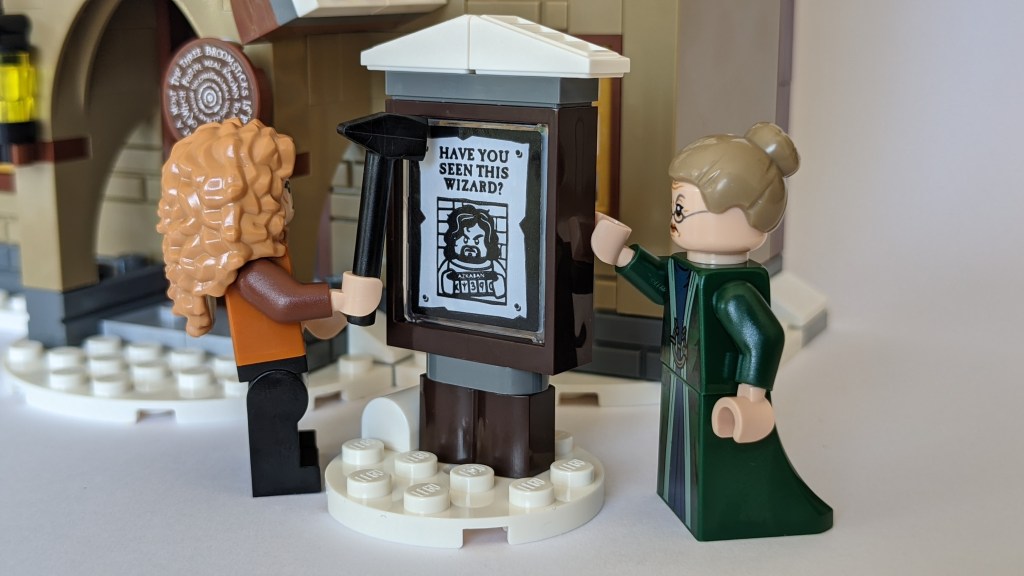 The inclusion of Rosmerta (who came with a hammer) and McGonagall, allows you to recreate a few scenes from the Prisoner of Azkaban, where the two ladies are in conversation with the Minister of Magic Cornelius Fudge. First, this was in front of the pub, where Rosmerta was waving a hammer when telling the minister how angry she was at the dementors, scaring away her customers. Secondly inside her apartment where Harry, under his invisibility cloak, overhears what Sirius Black had done, and that he is even his godfather.