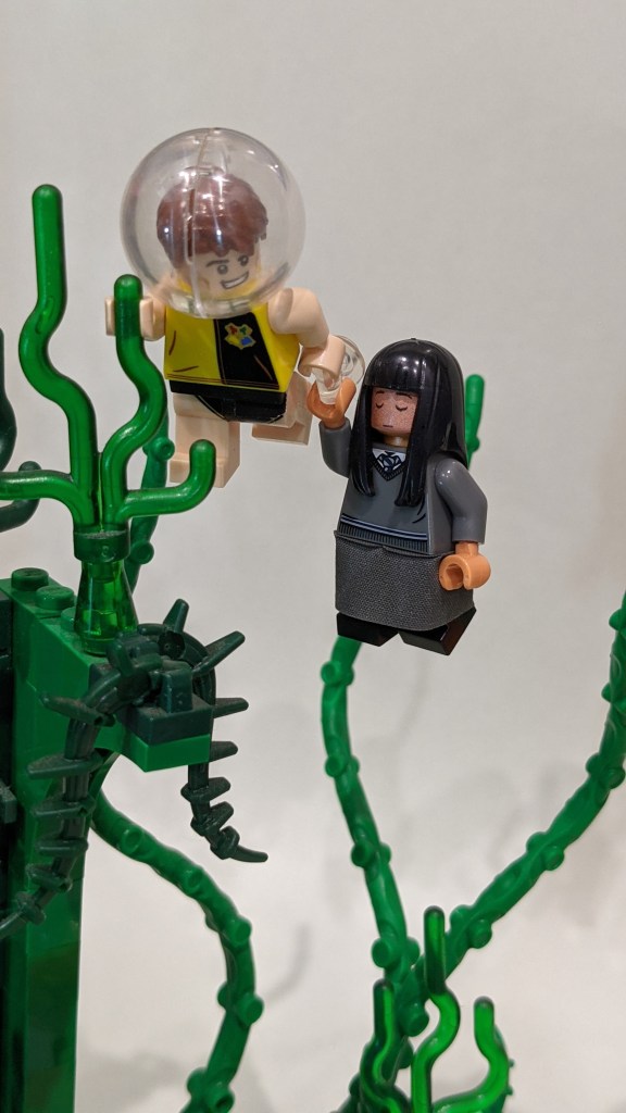 I’ve been building a series of MOCs lately to cover different scenes from the Goblet of Fire, including the Second Challenge of the Tri-wizard Tournament. The Rescue from the Merpeople set from 2005 gave us contestants Harry Potter and Viktor Krum. To allow them to swim underwater for an hour, Harry used gillyweed, and Viktor transformed partially into a shark. The other two contestants, Fleur Delacour and Cedric Diggory were however not included in the set, and both used the bubble-head charm to help them. This is how I added them…