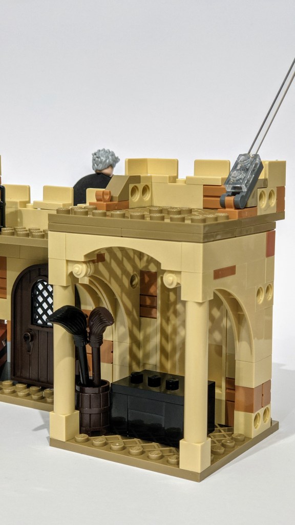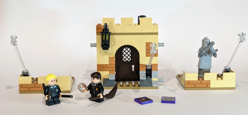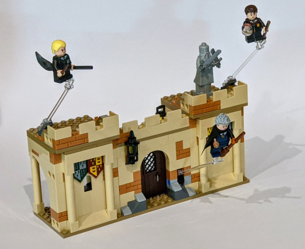 As earlier noted, the set comes with a section of Hogwarts to use as “backdrop” for the flying lesson scene, just as we saw it in the movie. It consists of a small wall section with an entrance to the castle, and two “towers” on either side. Calling them towers may be a stretch as they are the same height as the wall itself.