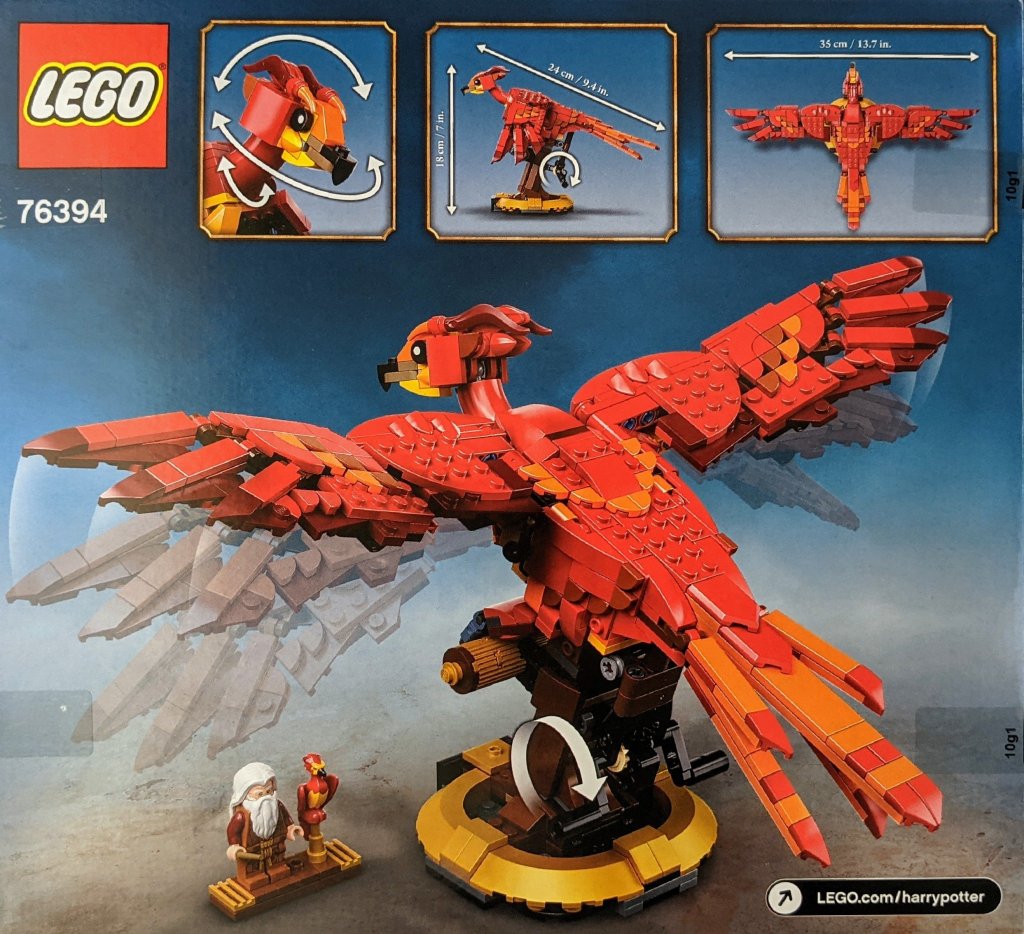 The front of the box shows the phoenix model on its stand. In the lower left corner, we can see it comes with a small stand with Dumbledore and Fawkes in minifigure scale, similar to the 2020 Hedwig set, which had Harry Potter and Hedwig included on a similar stand.
