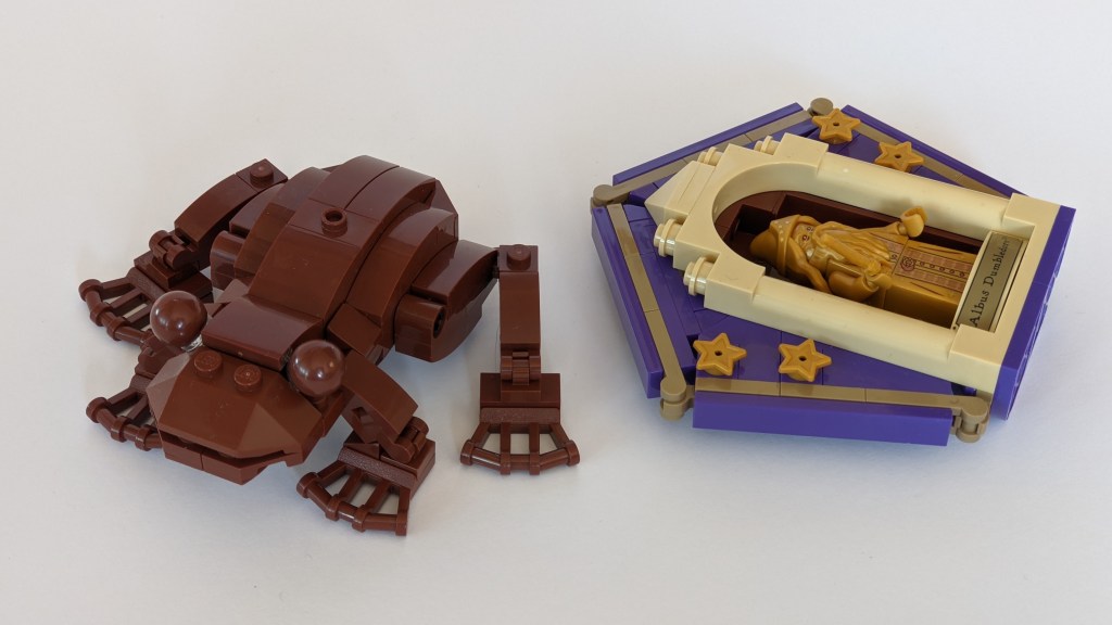 Bag 21 adds a chocolate frog, similar to those Harry bought from the trolley witch in the Hogwarts Express. The frog looks fantastic, but is probably a bit larger than what I would have hoped. The back legs are very posable, but the font legs are not, so you can’t pose it in that many different ways. Bag 22 adds a collectable wizard card to supplement the frog. These items are rather iconic and I’ve previously designed my own versions (instructions available here) of both as well as box that can fit both. The box unfortunately will not fit the larger frog included in this set, and is build in blue and gold, as the right pieces are not available in dark purple.