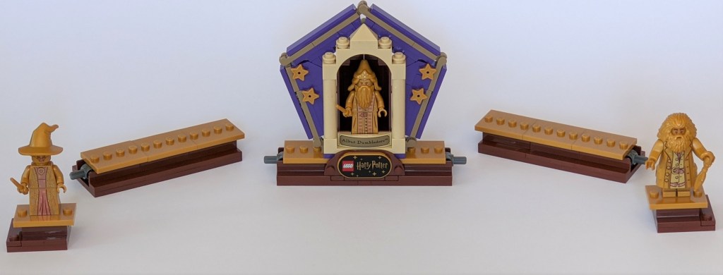 In particular, I like the collectable wizard card frame around Dumbledore. But the stand didn’t just fit the three included figures, it came with two extension pieces, to allow it to fit all the six previously released golden minifigures too.