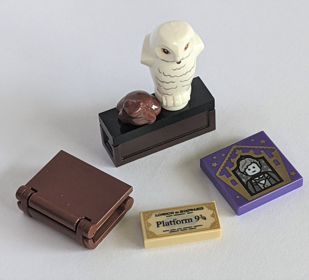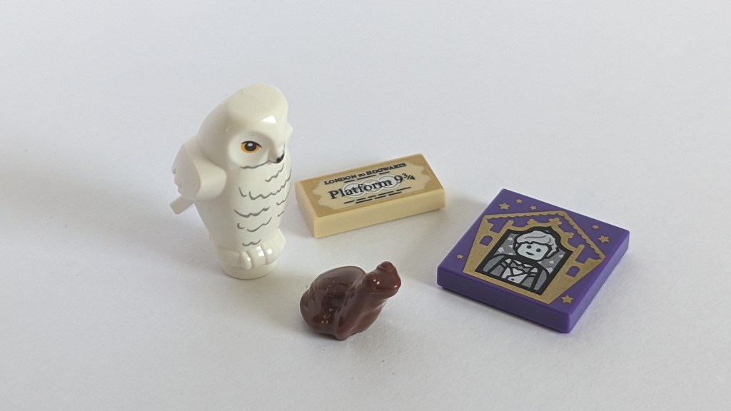 Once again I had to doublecheck behind the door to see if there was an extra plastic bag I had missed, but no – four bricks is what was there. The theme could still be Diagon Alley (Hagrid did give the white owl Hedwig to Harry as gift there) – but the chocolate frog, the associated wizard collectable card and the ticket to Hogwarts Express all relate to the subsequent travelling from Platform 9¾ to Hogwarts. Hedwig was part of the luggage Harry brought, so maybe the theme is just Hogwarts Express. Hopefully tomorrow will clarify.