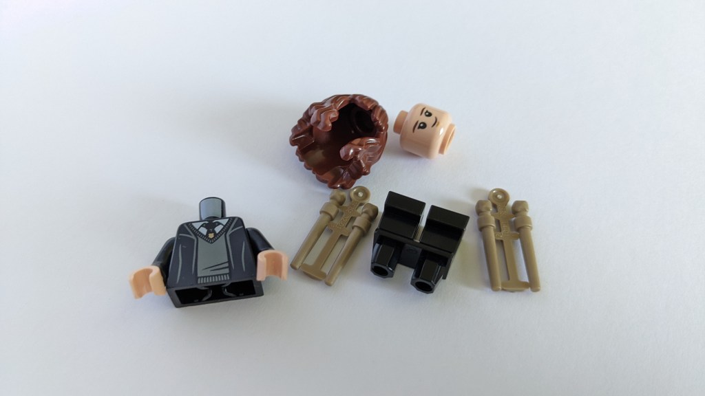 The torso is identical to the one that came with Ron. As I noted back then, it is a new torso design unique to this set, though it will also feature in the upcoming 2022 Hogwarts Magical Trunk set. The torso represents a neutral Hogwarts robe – that is without showing any Hogwarts house colours, as the uniforms students were wearing before the sorting ceremony. It is printed both on the front and on the back.
